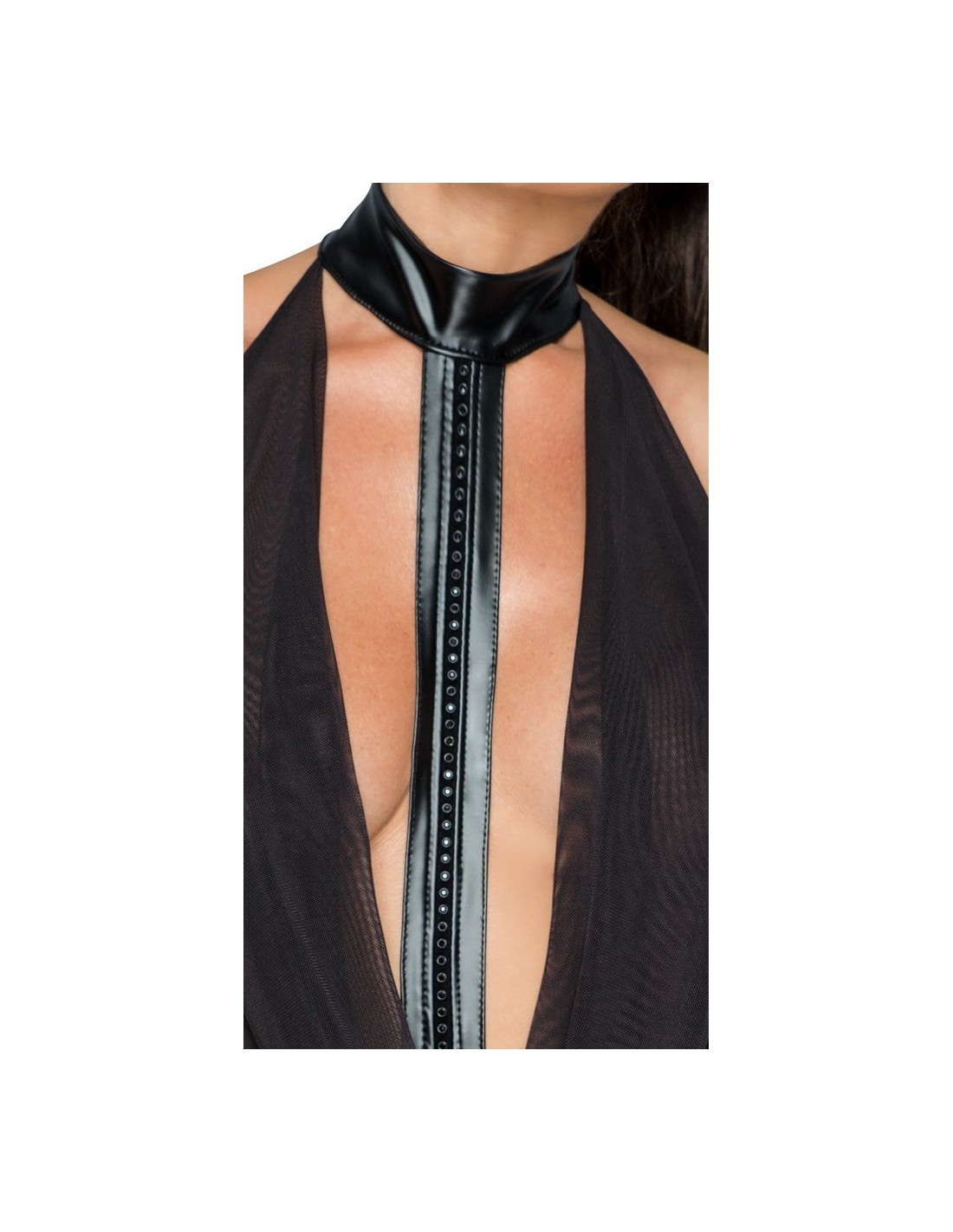 Abito aderente realizzato in effetto bagnato lucido opaco. L'abito ha una parte superiore a rete ondeggiante. Il cinturino anteriore è decorato con pietre scintillanti e si accede al colletto con una chiusura a gancio. È completamente senza schienale per una vista straordinaria: solo i glutei sono coperti dalla parte della gonna.