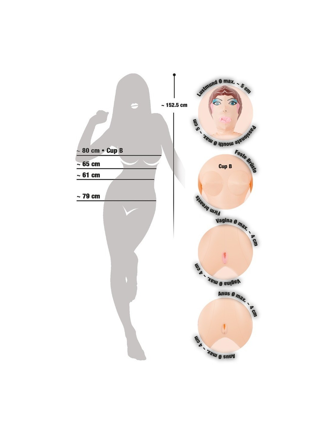 Lei manterrà tutti i vostri desideri sessuali! "Joann" renderà ogni uomo pazzo. Alzarsi e sperimentare questa ragazza da sogno: Viso d'angelo, le labbra sexy vi daranno un bel pompino, il suo corpo incredibilmente bello con la pelle di velluto e seni sodi. Vi seguirà in qualsiasi posizione sessuale, la stretta figa e ano sono pronti per voi. Gonfiabile alle dimensioni della vita, con 3 fori di lussuria e capelli castani impressi.