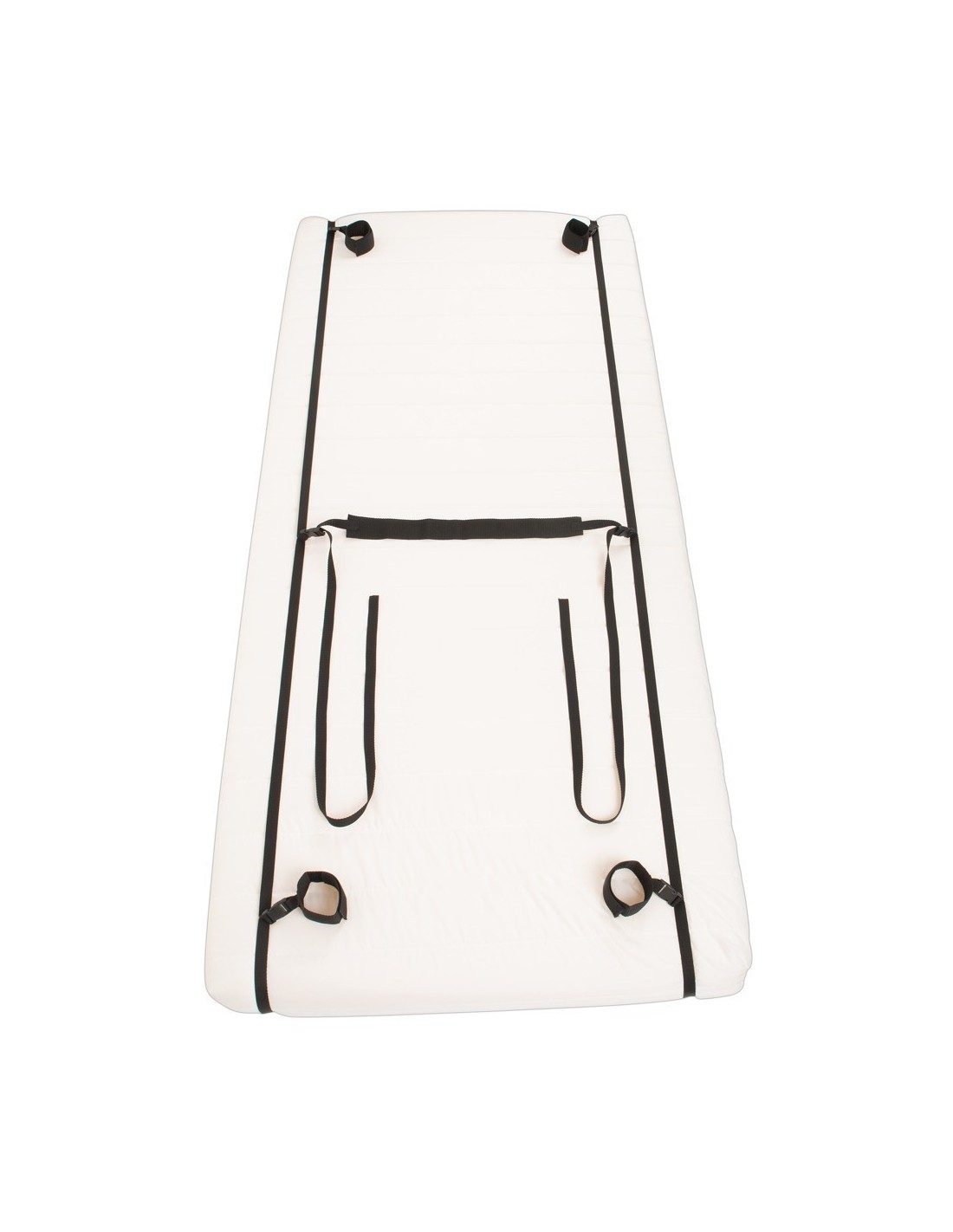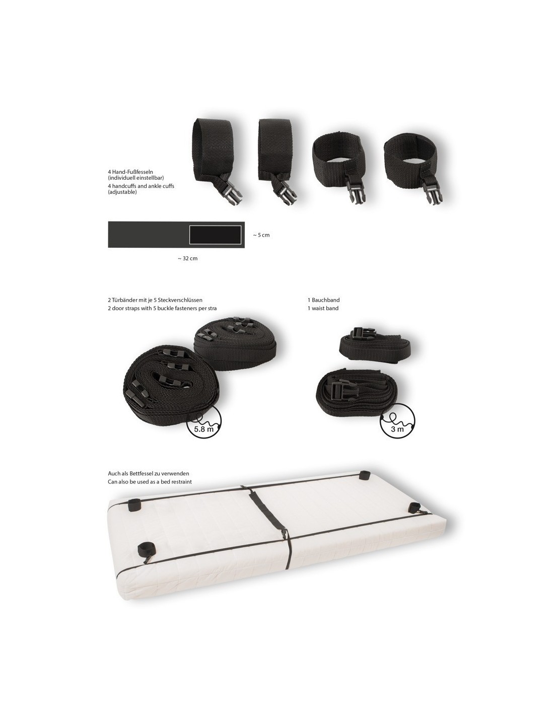 Cinghie da letto/porta ciascuna lunga 5,80 m (regolabile); cinghia in vita lunga 3 m (regolabile), rinforzata al centro lunga 50 cm; polsini di contenimento larghi 5 cm, lunghi 32 cm, regolabili con velcro. PP, PS.