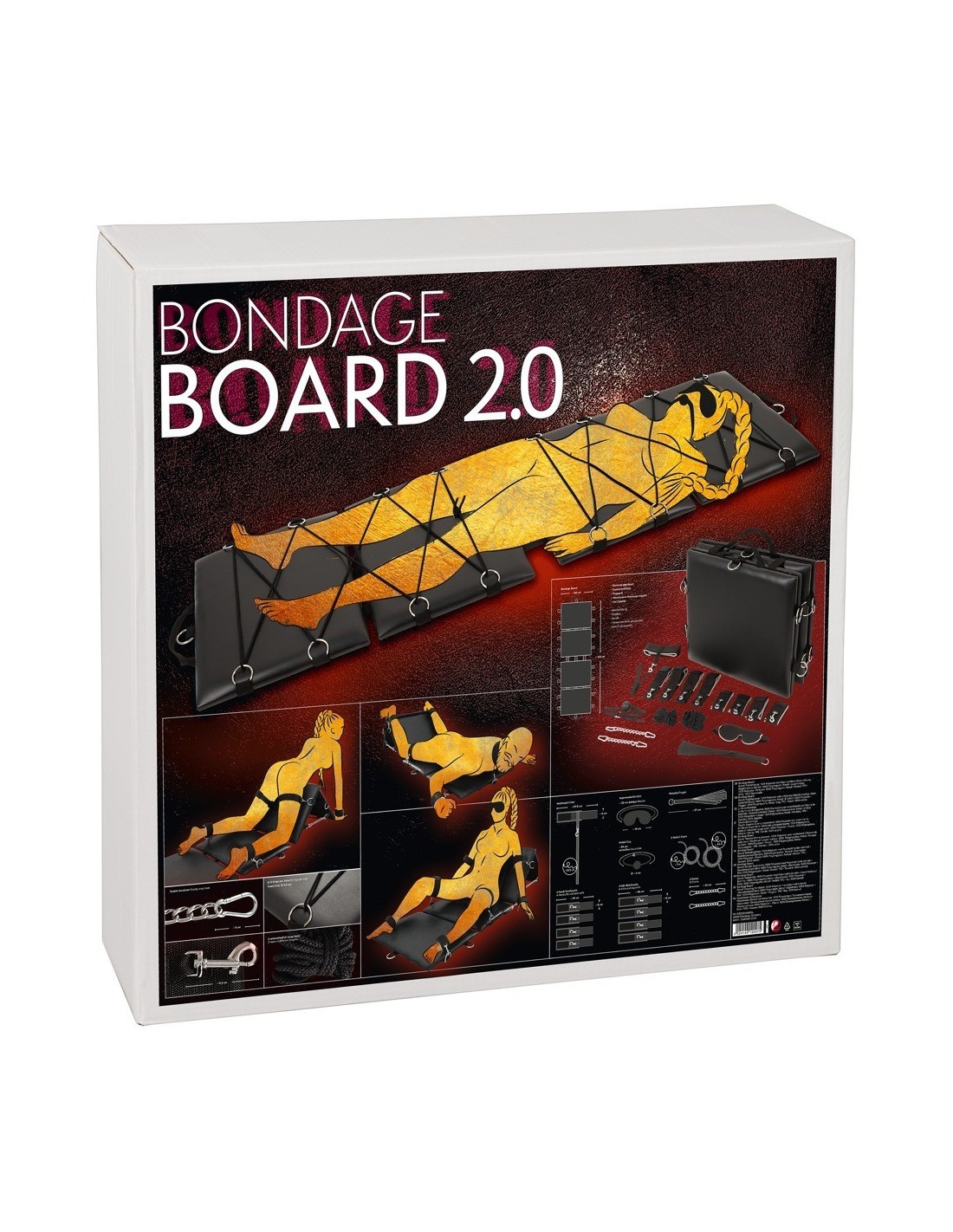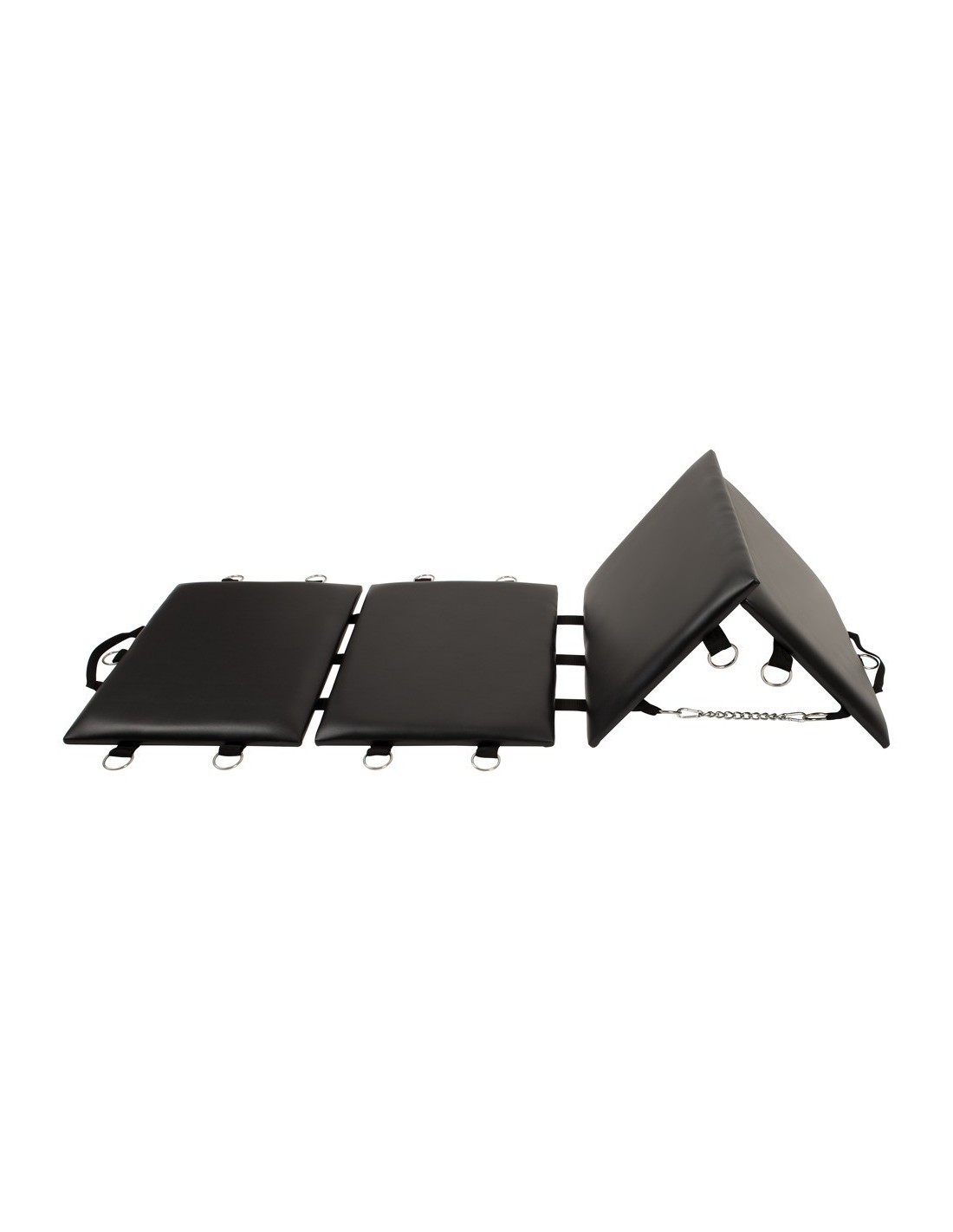Tavola bondage 2.0 di You2Toys, composta da 4 superfici imbottite di seduta/sdraiata (60 x 60 cm) con rivestimento in similpelle di alta qualità e facile da curare, collegate tra loro da 3 cinghie stabili antistrappo. Questo rende la tavola molto flessibile, così che sono possibili diverse posizioni di bondage e la tavola può essere ripiegata dopo il gioco e facilmente trasportata o riposta.