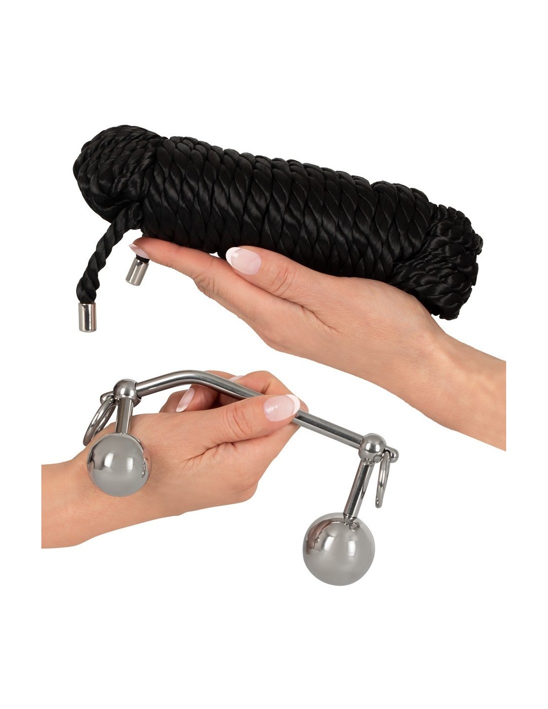 I 2 tappi a sfera di diverse dimensioni scorrono sulla barra liscia e sono quindi regolabili individualmente per chi li indossa. Le sfere possono essere svitate dai colpi e sostituite. Ogni estremità della barra ha un anello di fissaggio per la corda di bondage allegata, che viene legata al corpo/collo e fissa i ball plugs.