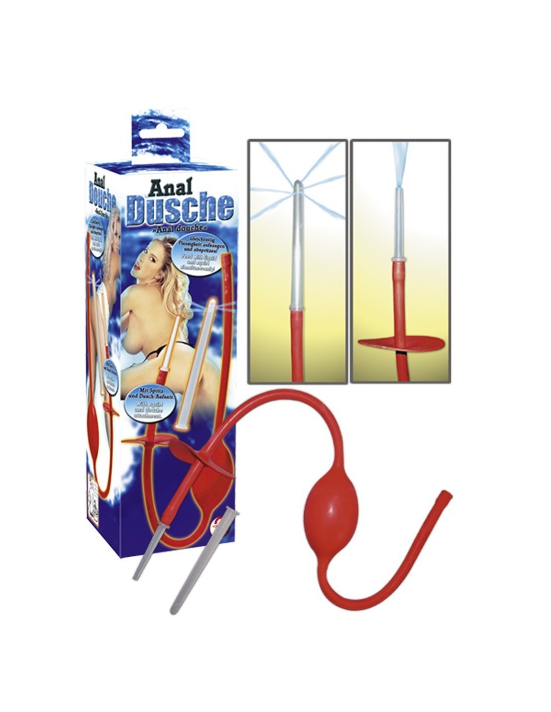 Doccia intima costituita da un tubetto lungo 48 cm, possedente: al centro una pompa manuale; ad un'estremità la parte aspirante; all'altra estremità l'aggancio in cui porre lo spruzzo anale (lungo 6 cm, Ø 0.5-0.8) o la doccia vaginale (lunga 12 cm, Ø 0.5-1).