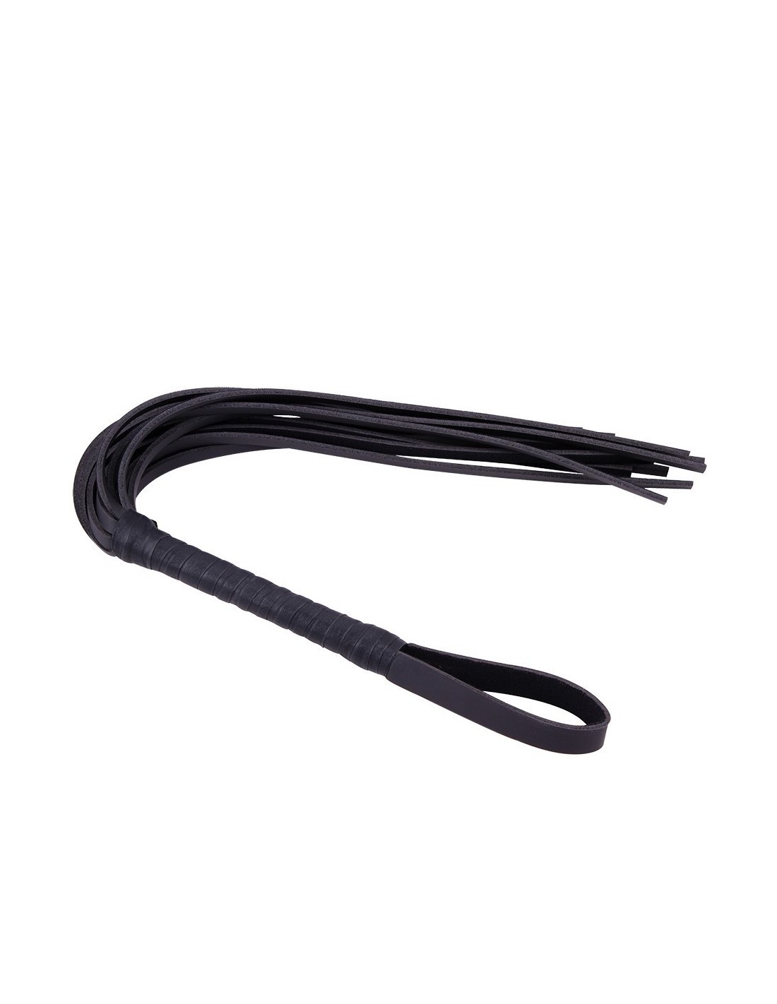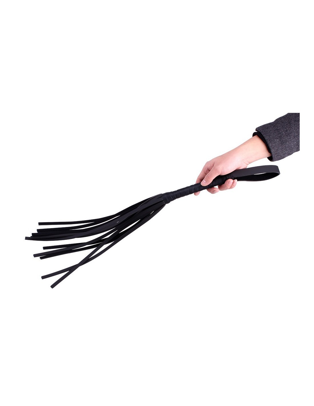 Frusta nera, tipo flogger, con più code dotata di impugnatura a intreccio e gancio per appenderla.