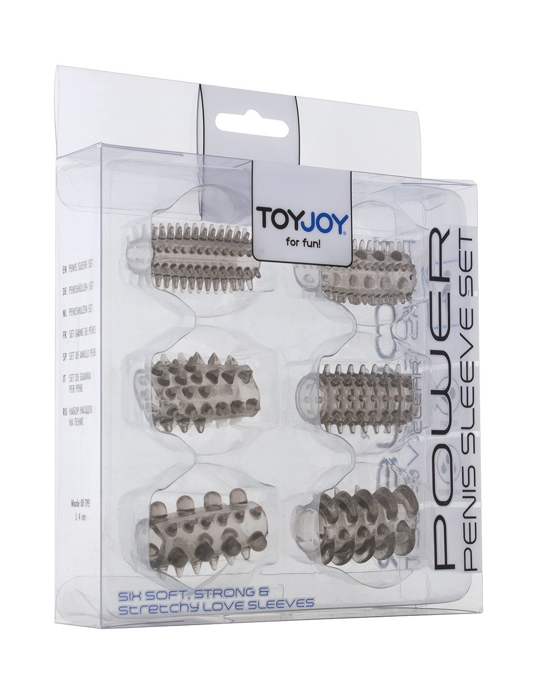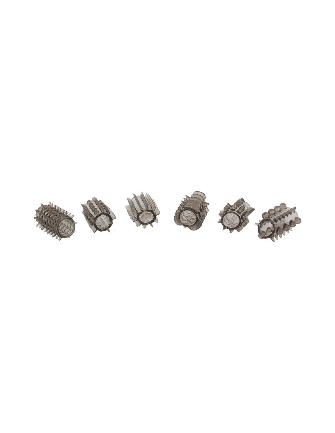 Set di 6 guaine falliche di colore nero in silicone medicale estremamente estensibili. Aumentano la durate dell erezione e ritardano l' eiaculazione e grazie ai rilievi sul corpo esterno forniscono piacere intenso al partner sia per utilizzo anale che vaginale. Possono essere utilizzati anche sulle dite per una stimolazione intensa del punto G.