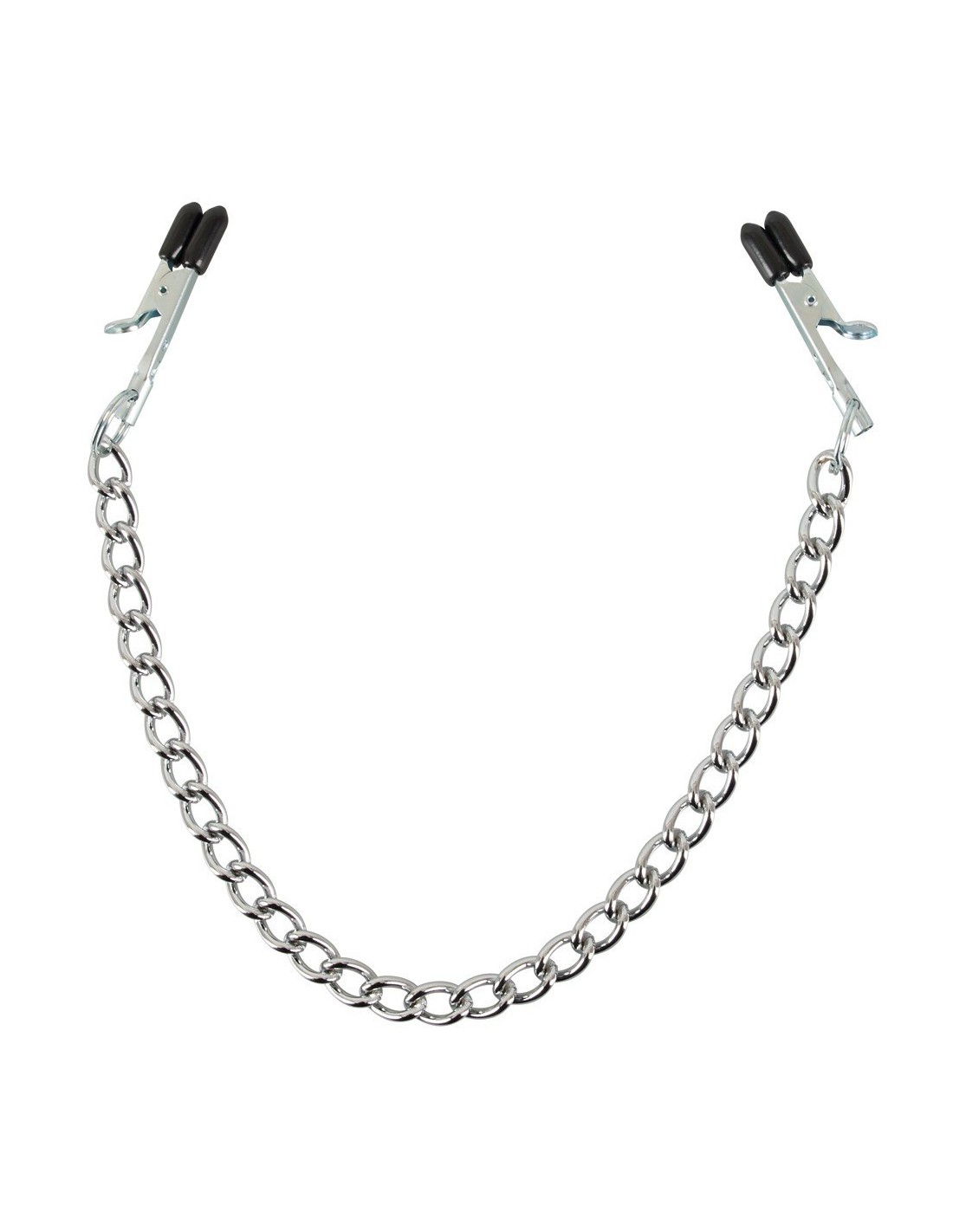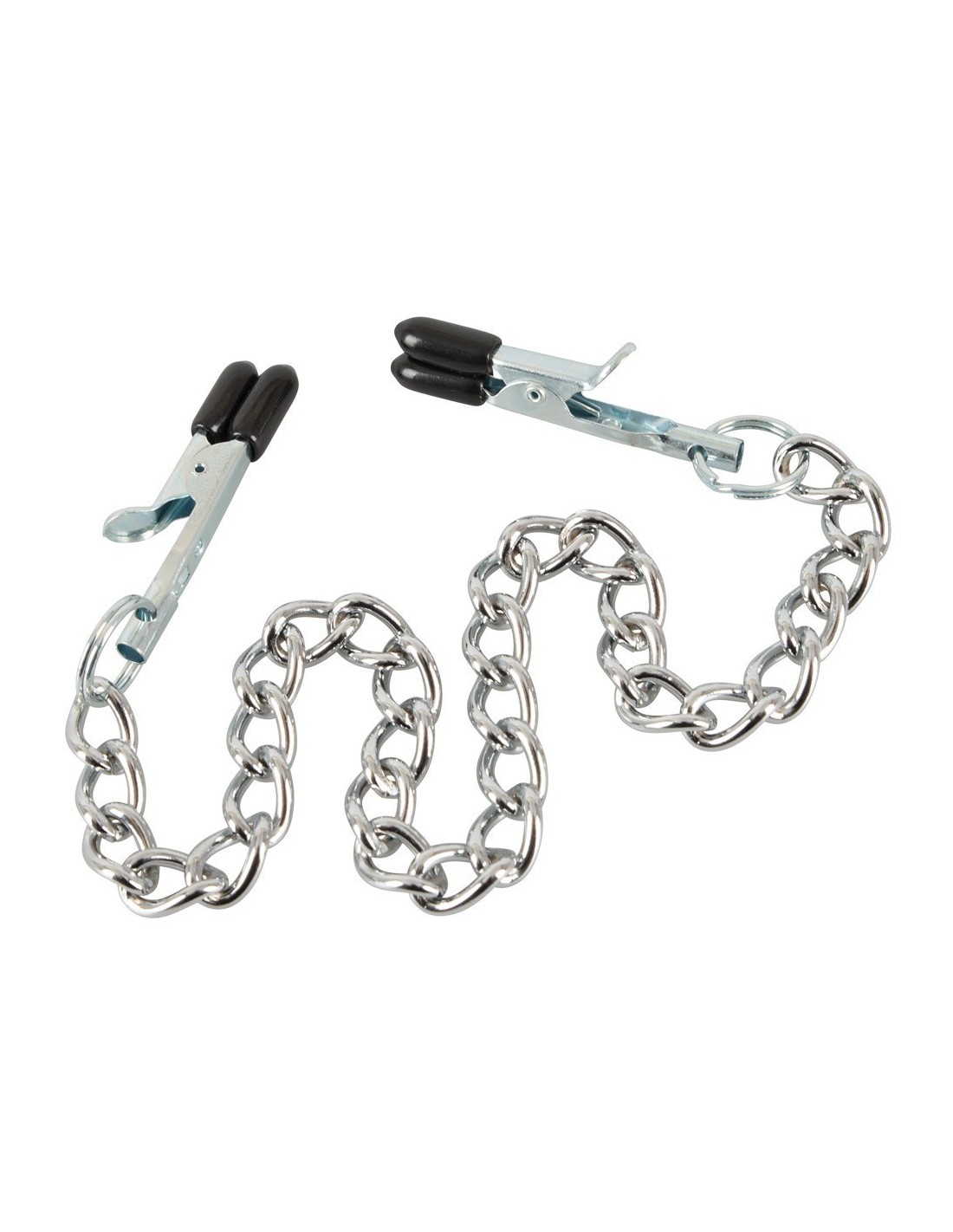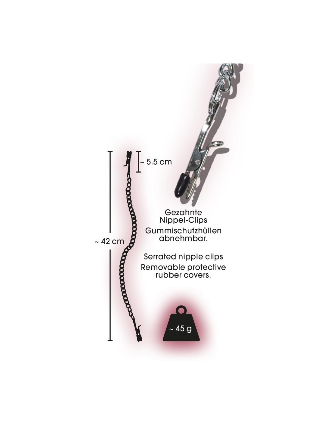 Sensazioni intense e lussuriose. Pinze per capezzoli dentate con guaina protettiva rimovibile. Lunghezza catena 30 cm. • Materiale: metallo.