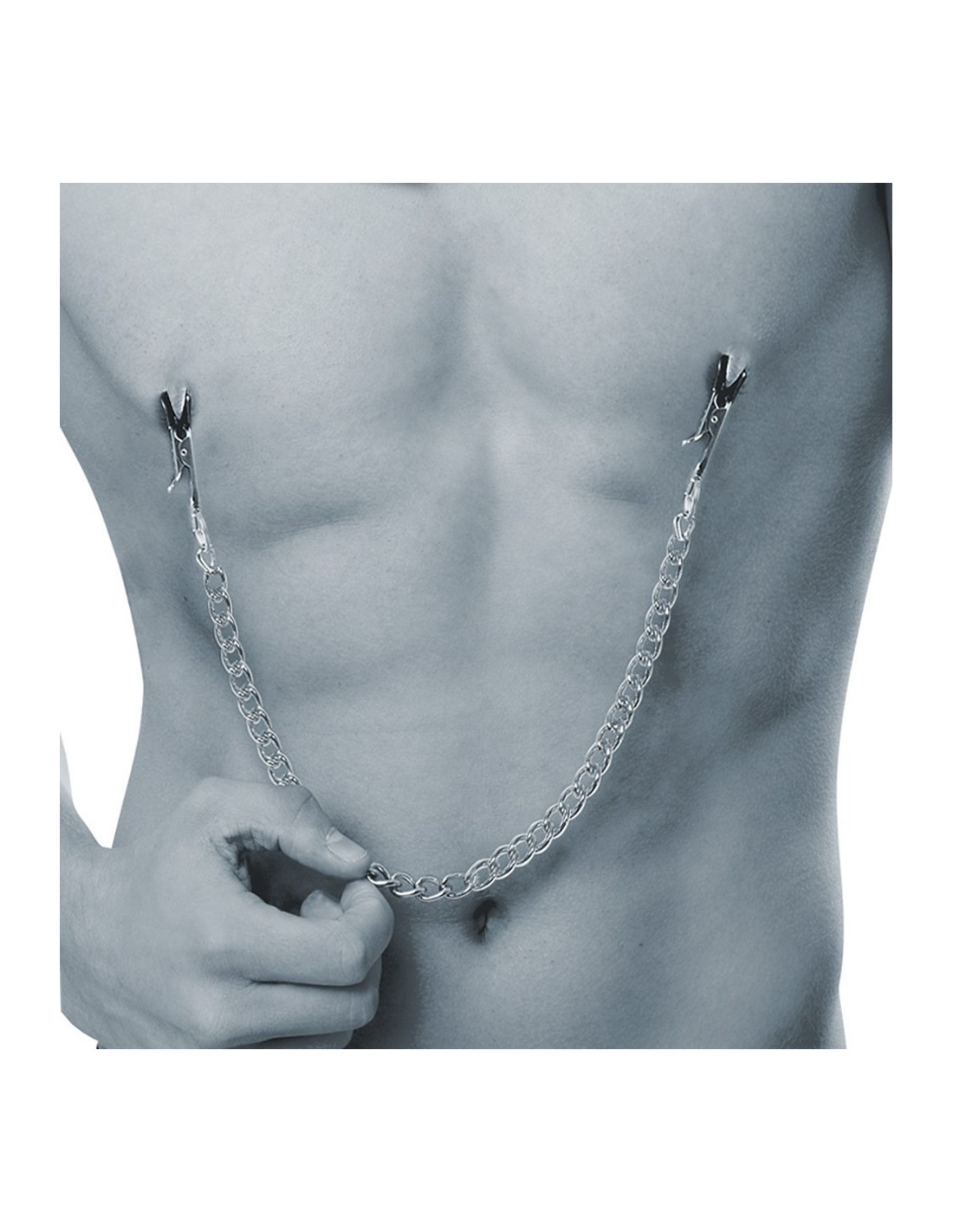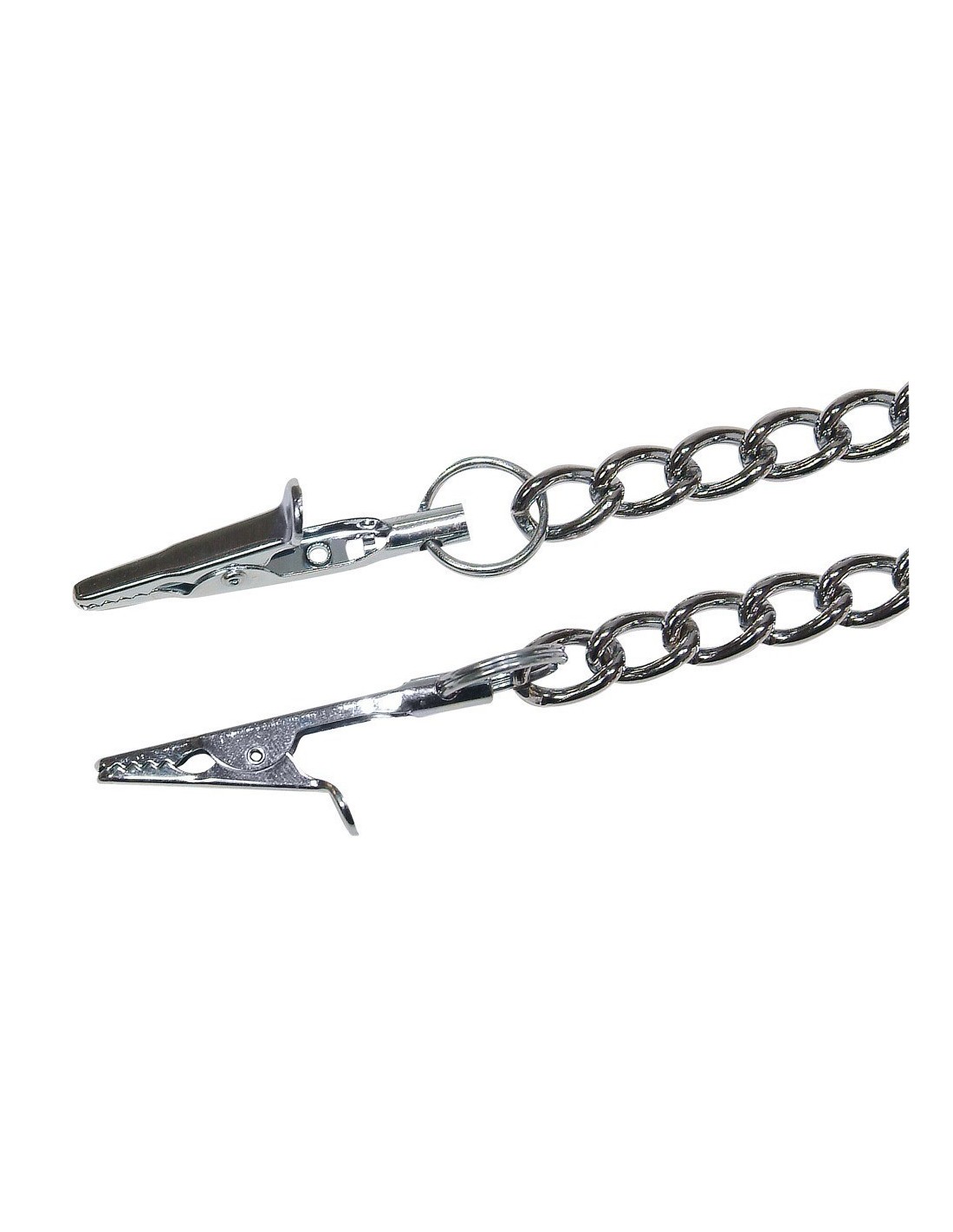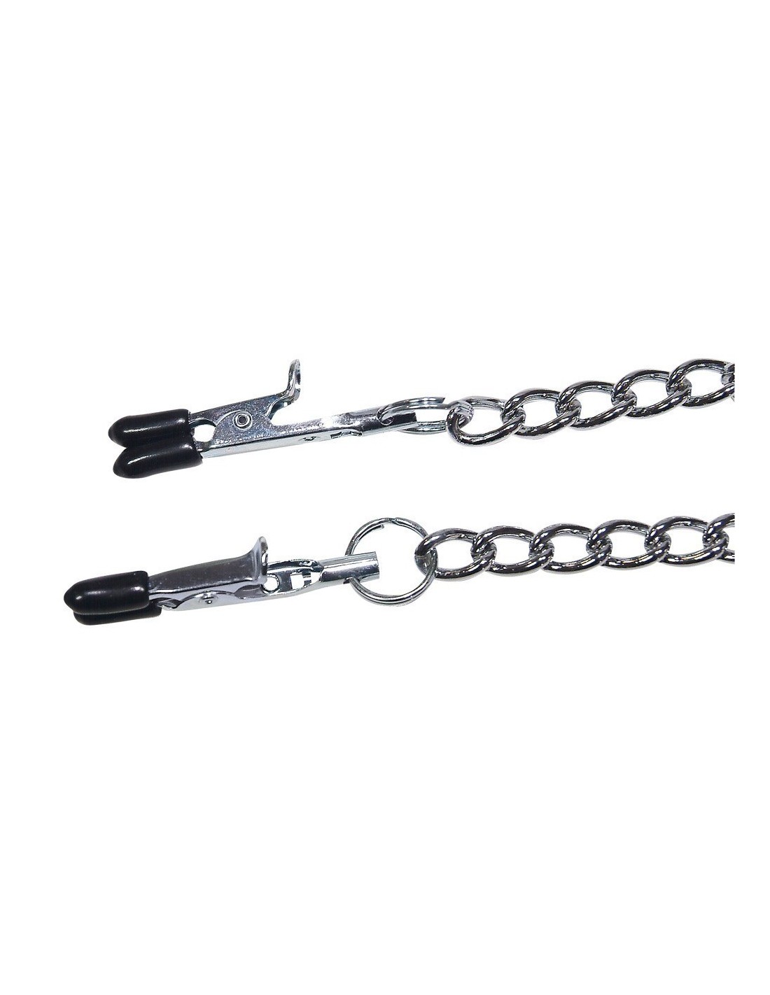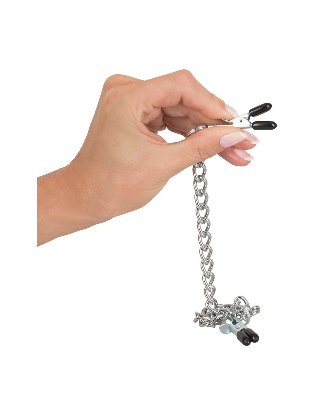 Sensazioni intense e lussuriose. Pinze per capezzoli dentate con guaina protettiva rimovibile. Lunghezza catena 30 cm. • Materiale: metallo.
