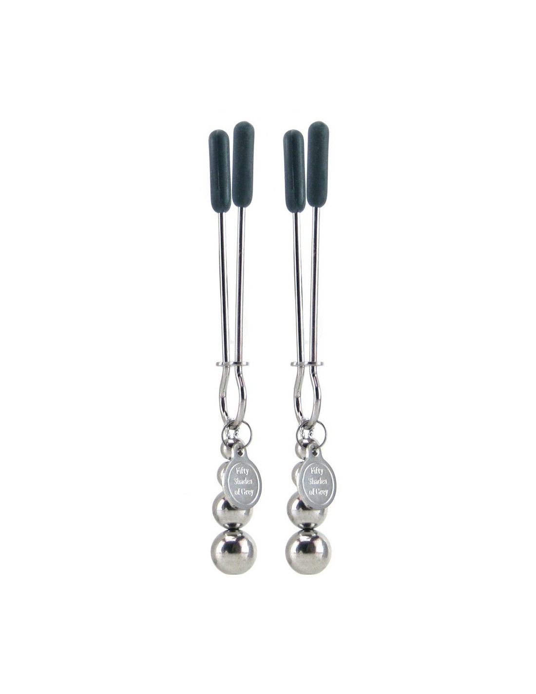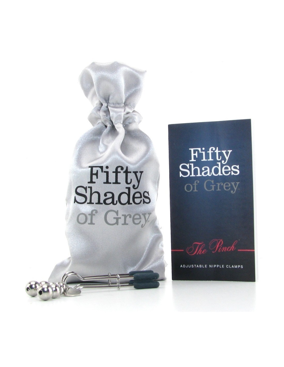 50 SFUMATURE DI GRIGIOSet professionale di pinze per capezzoli con regolazioni ed estremità ricoperte in morbido silicone. Dalla serie ufficiale di 50 sfumature di grigio, un gioco di dolore misto a piacere, intenso piacere. Due pesetti posti alle estremità della catena garantiscono vibrazioni più intense dovute al momento per un'impennata della sensibilità del capezzolo e del piacere.