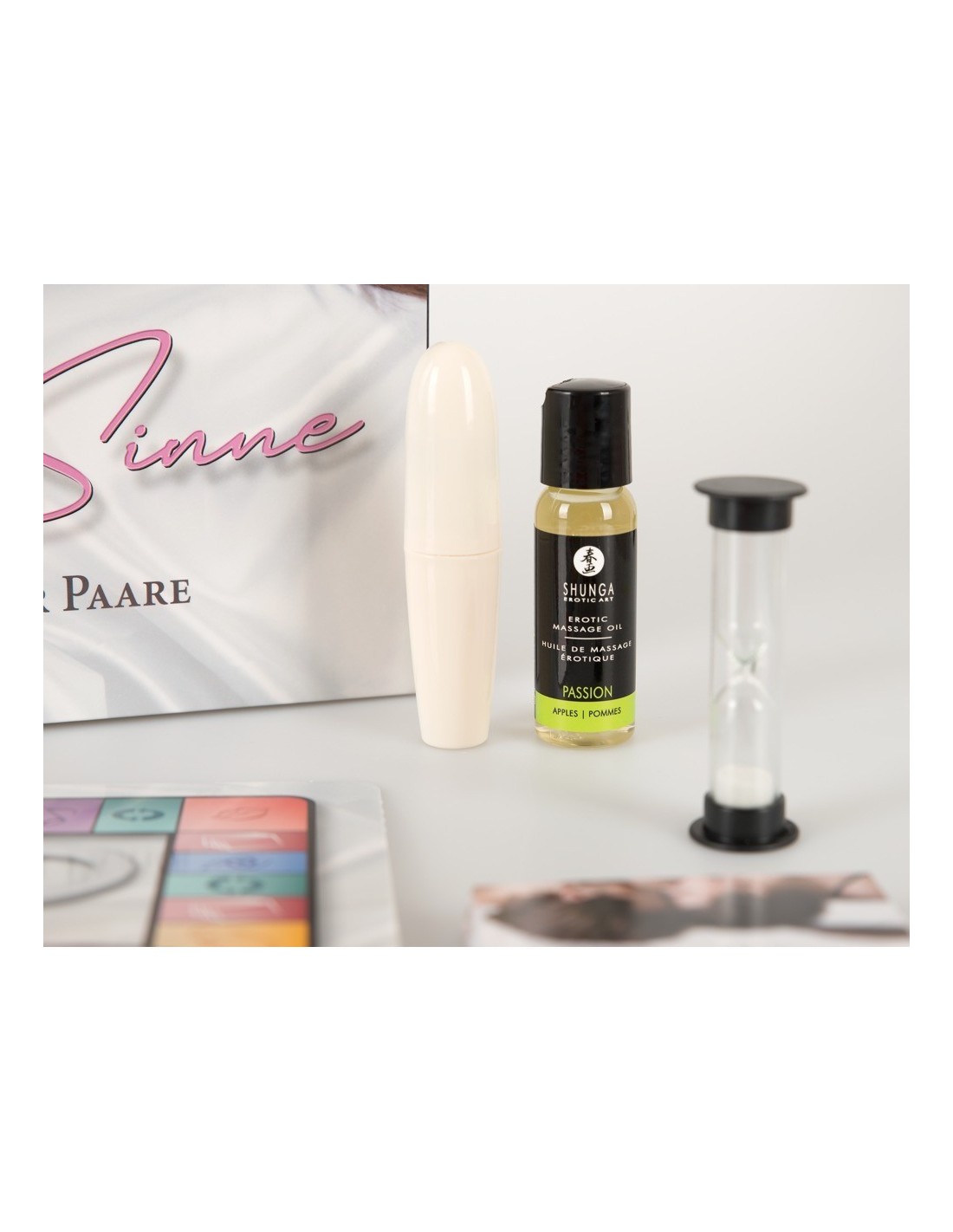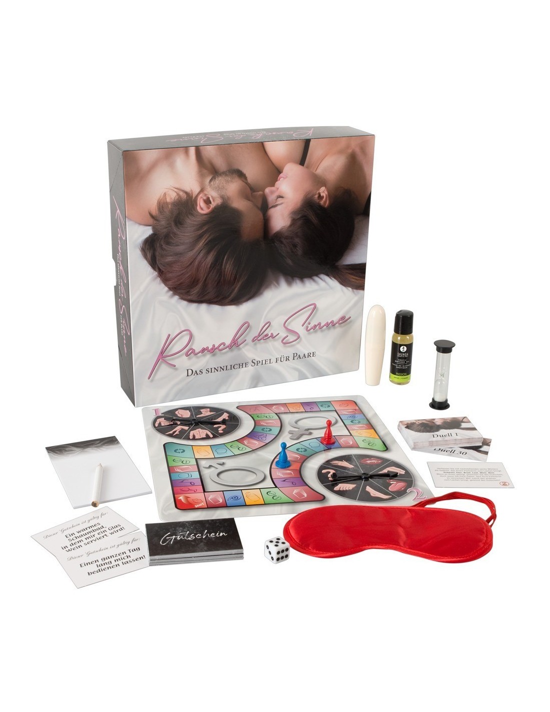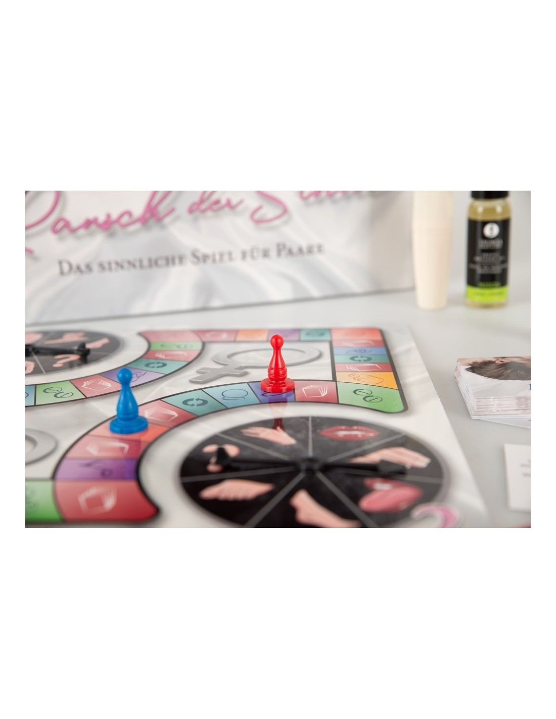 Gioco di coppia sensuale per 2 giocatori. Contenuto: regole del gioco, tavola da gioco con 2 dischi rotanti, 2 pedine, 1 dado, olio per messagi erotici, vibratore di