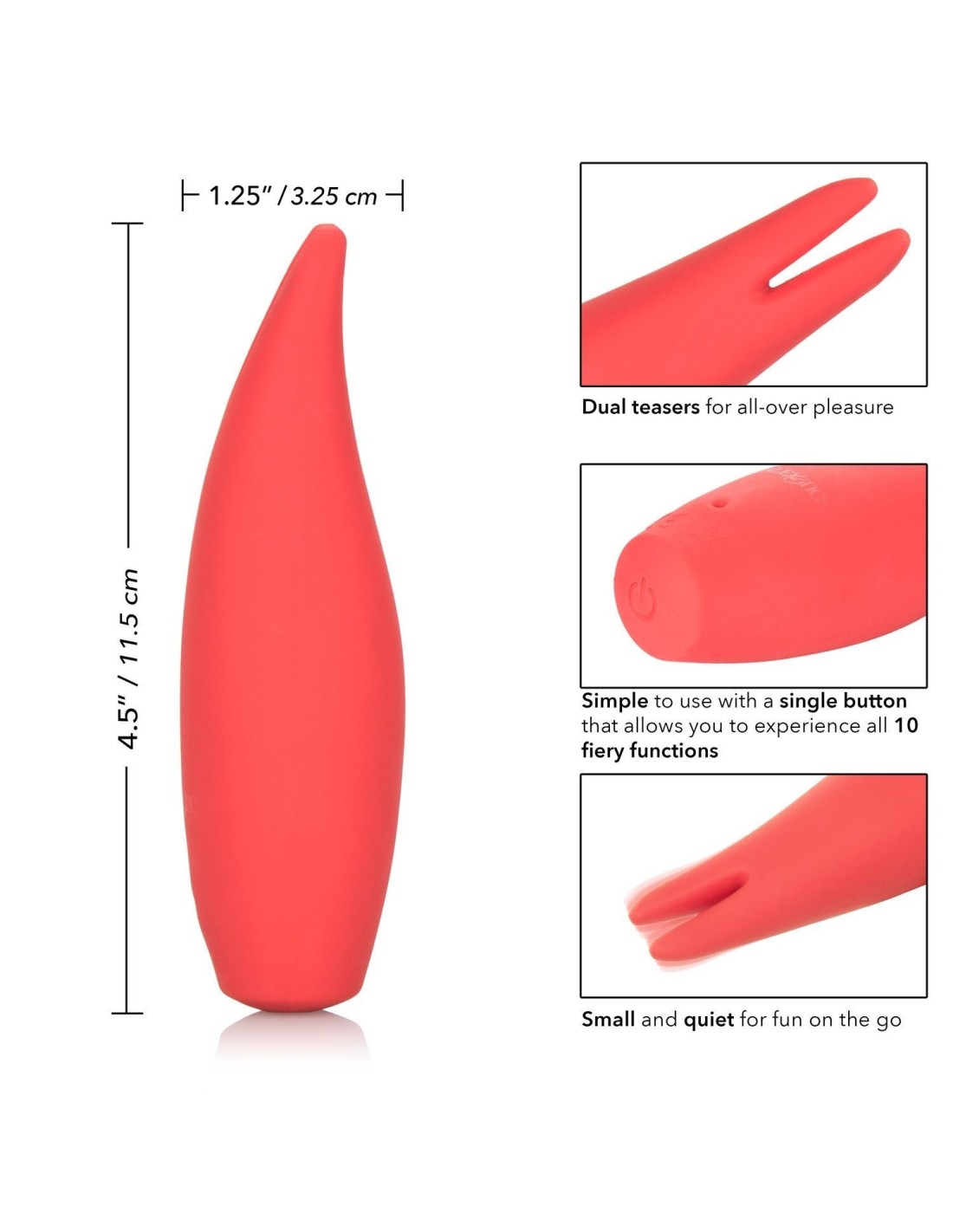 Un discreto massaggiatore \"che ovunque\" soddisfa ogni lussuria con un piacere gratificante. Sì, è un Red Hot con un intenso motore a 10 funzioni e un corpo sinuoso realizzato in silicone premium non profumato, non poroso e ipo-allergenico. Red Hot Flare ti accende grazie ad una batteria ricaricabile agli ioni di litio. Un cavo USB universale è incluso nella confezione. Facile da usare e silenzioso, per un piacere privato come te. Condividi con un partner o usalo da sola. In entrambi i casi questo massaggiatore impermeabile al 100% sarà il tuo piacere.