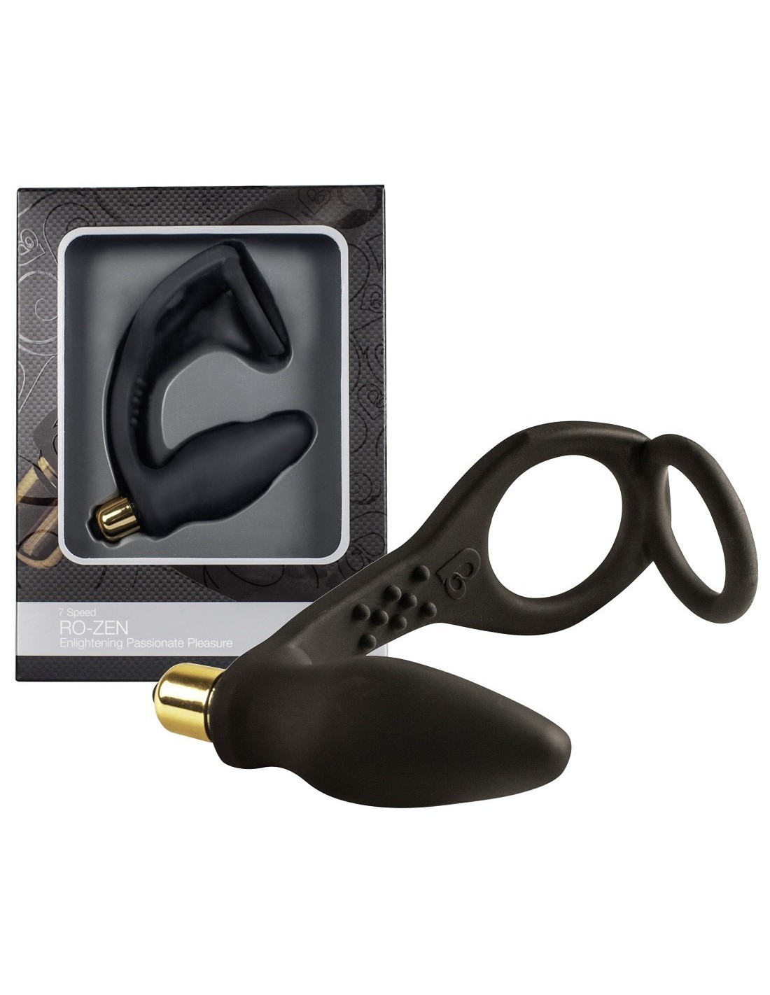 Stimolatore prostata RO-ZEN con vibrazione e doppio anello. Durante la penetrazione gli anelli sostengono e avvolgono pene e testicoli donando dure erezioni. Nella continuazione tra anelli e vibratore sono presenti numerosi rilievi che hanno il mirato obiettivo di stimolare il perineo. • Materiale: silicone • 7 modalità di vibrazione • Linghezza stimolatore 14 cm • Batterie incluse