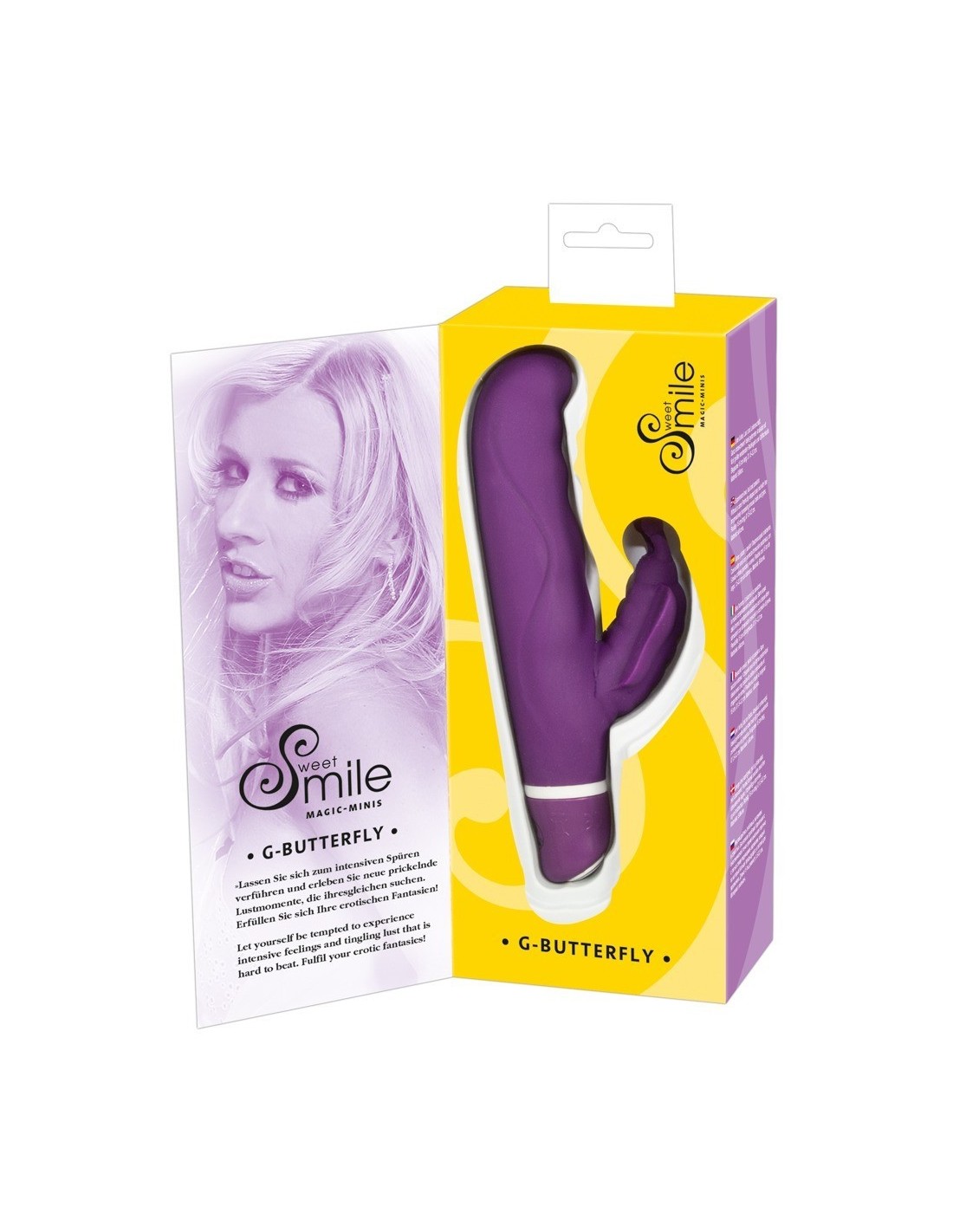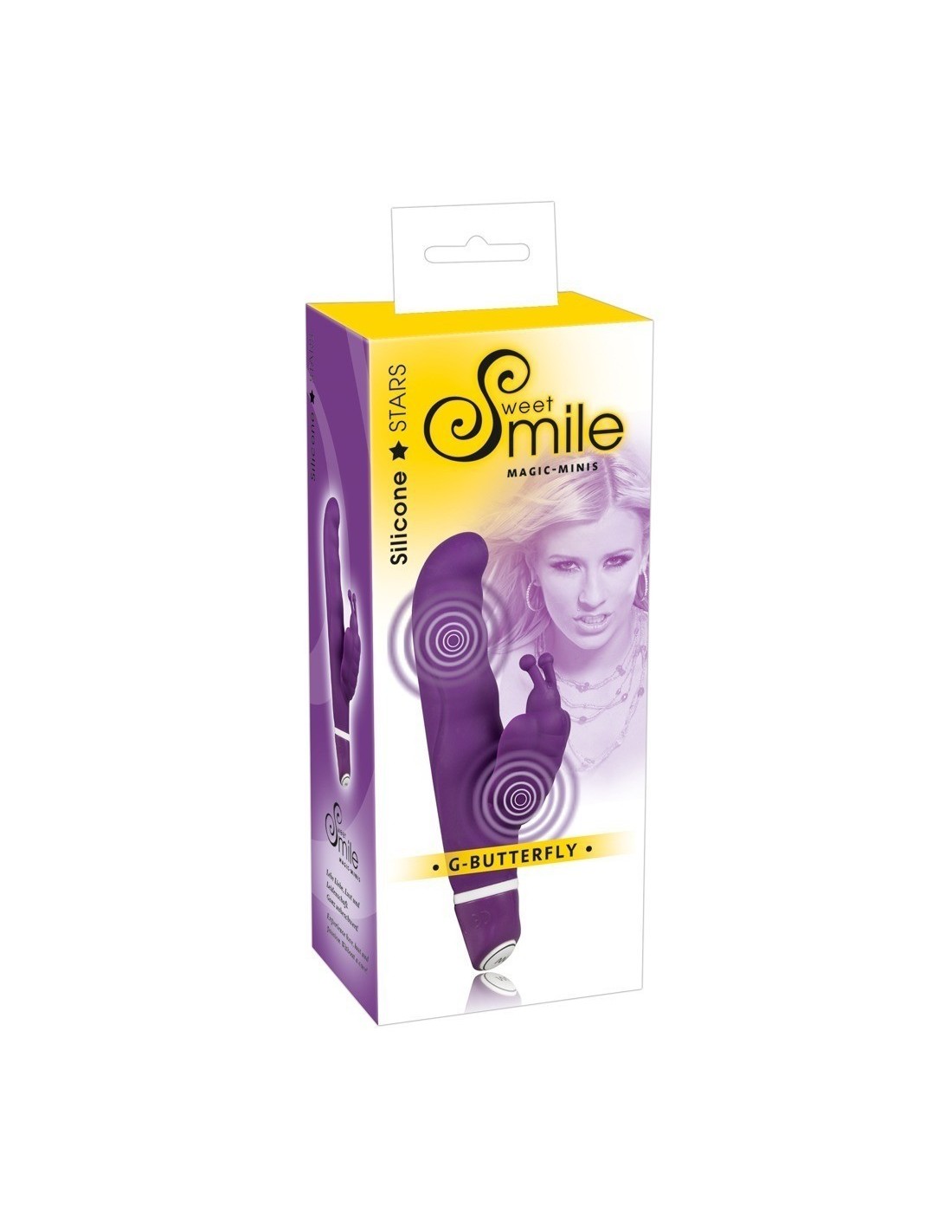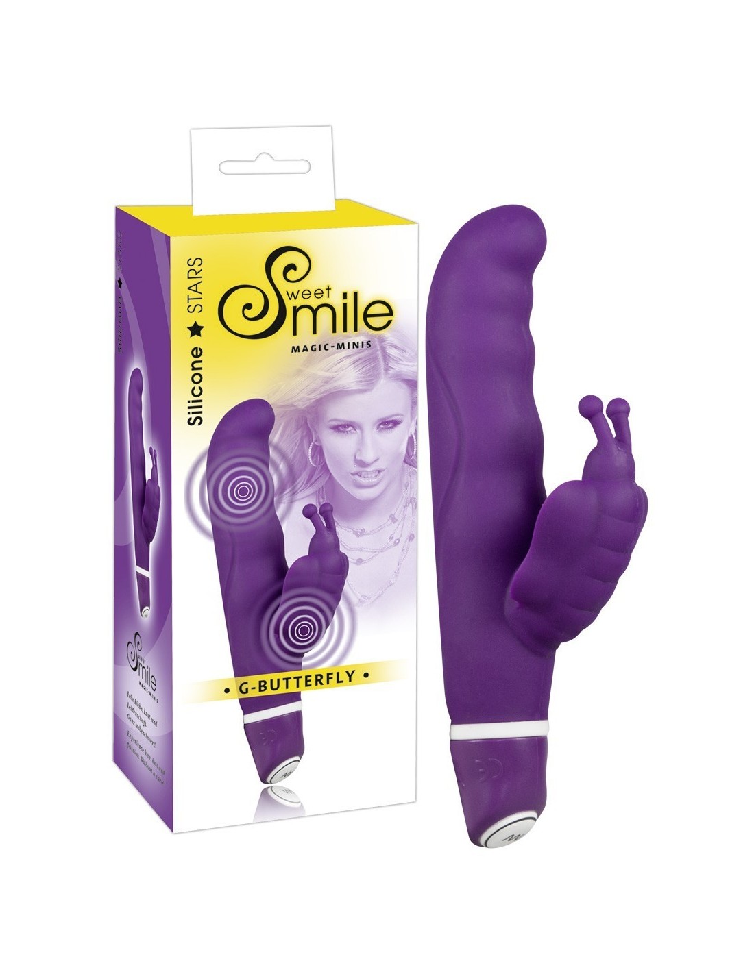 Un vibratore leggermente diverso! Vibratore con stimolatore a forma di farfalla. Con due Motori: uno a punta per il punto-G ed uno per il clitoride. I 7 tipi di vibrazione possono essere controllati premendo un pulsante. • Colore: Viola. • Lunghezza totale cm 15,5, inserimento profondità 8,5 cm, Ø circa 2,5 cm • Materiale: silicone, ftalati in conformità EU regolamento 1907/2006/CE. • Batterie non incluse: 2 x Micro/AAA