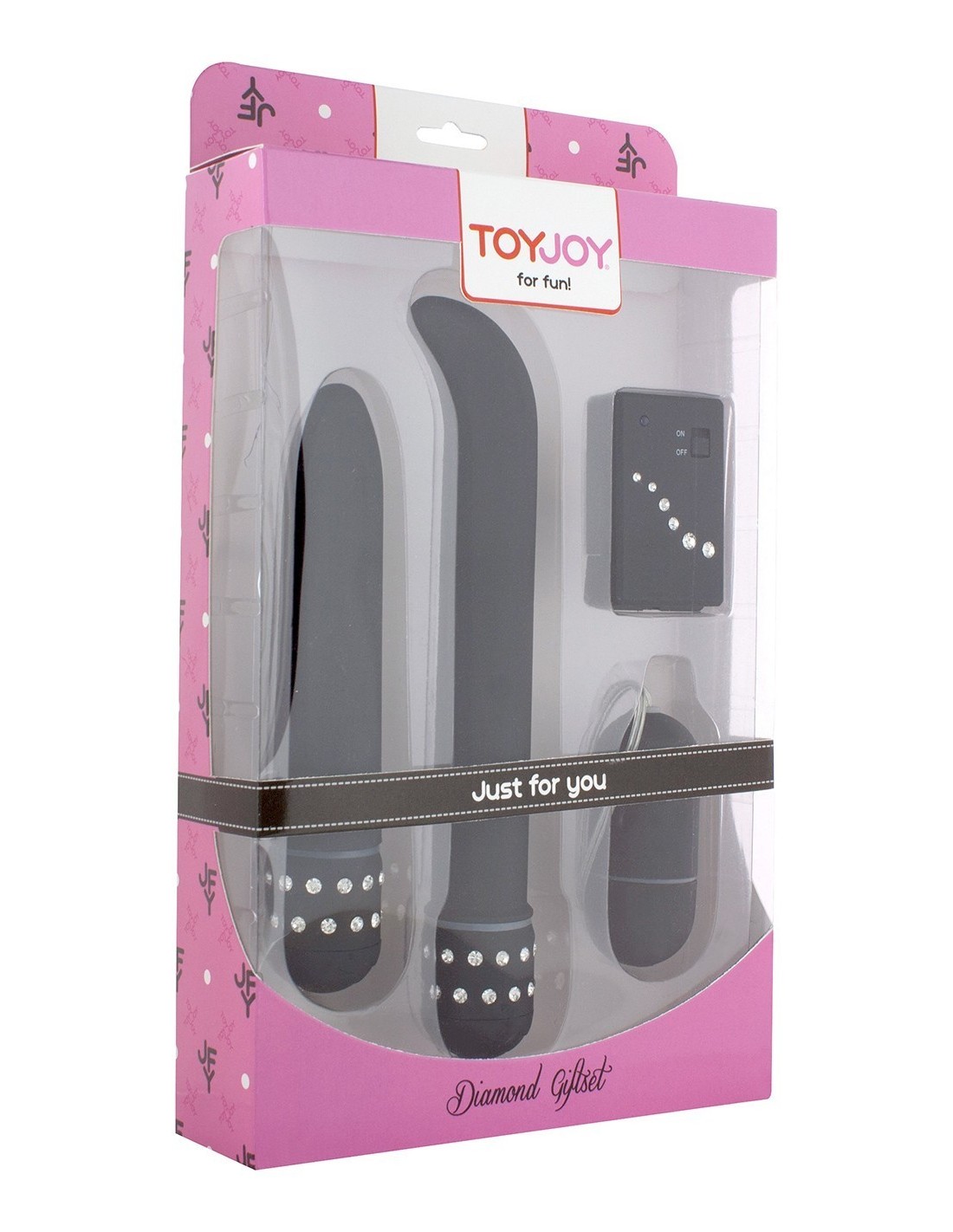 Fantastico set regalo composto da Ovulo Vibrante, mini vibratore e vibratore curvo per stimolazione del punto G e telecomando senza fili... il tutto di colore nero e decorato con strass luccicanti.